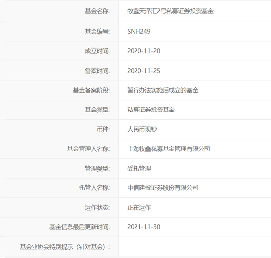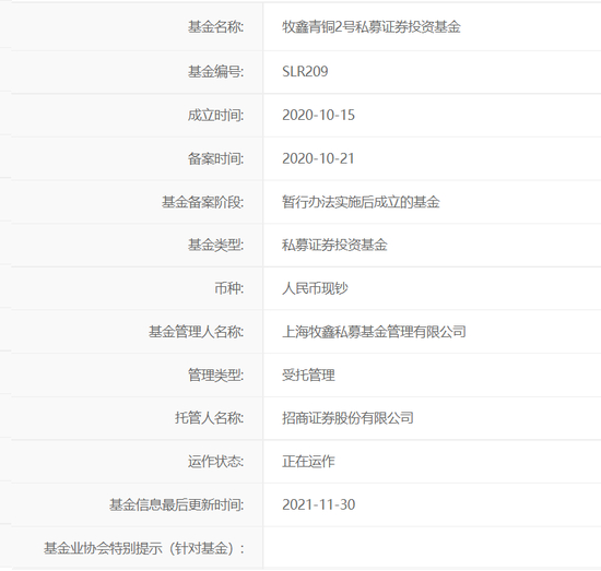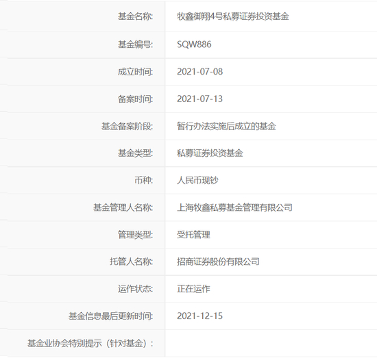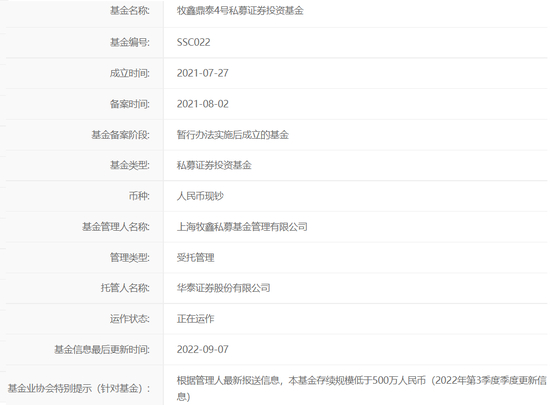通过中基协私募产品信息,行家查到,前述四只“牧鑫”系列,均为上海牧鑫私募基金管理有限公司(简称:牧鑫私募)旗下。其中,牧鑫鼎泰4号规模低于500万元,有中基协提示。