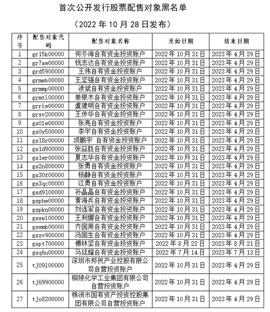 其中,《首次公开发行股票配售对象黑名单公告(2022年第8号)》将在2022年7月参与主板IPO项目网下申购过程中违反《首次公开发行股票承销业务规范》规定的27个股票配售对象列入黑名单。从名单来看,主要是自然人投资账户。