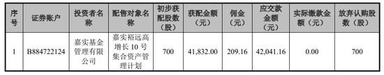 另一方面,行家查看了丛麟科技(688370.SH)在今年8月首发上市之际的公告。这只科创板新股,中签率为0.02398227%。嘉实裕远高增长10号作为网下投资者,中签700股,获配金额为4.18万元,连同佣金在内应缴4.20万元。但在缴款阶段,嘉实裕远高增长10号全额弃购,由主承销商中信证券包销。