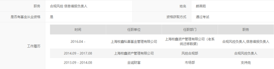 合规负责人颜燕茹女士履历显示,她曾任职于金诚财富市场支持部门,其后加入牧鑫私募任合规总监。此外,她的基金从业信息仅显示在牧鑫私募这一条任职信息。