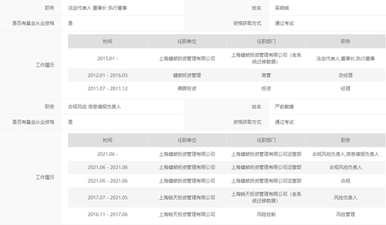 据中基协备案信息,健顺投资的实控人、法定代表人、董事长、执行董事吴晓威,除2011年在鼎晖投资短暂任职外,没有别的经历。合规负责人严俞敏婕女士,曾在上海锐天投资管理有限公司(简称:锐天投资)任合规风控负责人。