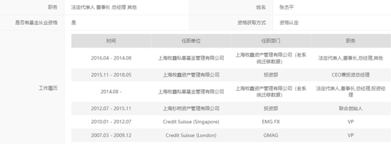 在中基协备案的高管履历显示,牧鑫私募的法定代表人、董事长、总经理张杰平,早年曾在Credit Suisse位于伦敦和新加坡的机构任职。在私募领域,他曾是上海杉树资产管理有限公司(简称:杉树资产)的联合创始人。或许因为海外任职经历,他通过资格认定获得基金从业资格。