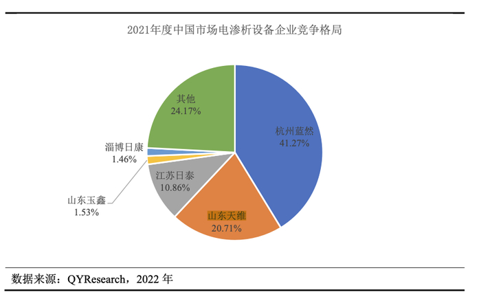 根据QYResearch数据显示,杭州蓝然2021年电渗析设备收入在全球市场份额为8.88%,排名第三,仅次于Suez和Evoqua;在中国市场占有率为41.27%,排名第一,其次为山东天维、江苏馹泰,另外报告期内一直保持全国第一的市场地位。