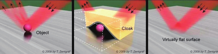 科学家们在2009年成功实现了地毯式光学隐身衣。 徐磊实现隐身一直是人类自古以来的梦想:从《西游记》中孙大圣的隐身术到《哈利波特》中哈利的隐身斗篷,这一梦想受到全世界人们的广泛关注。隐身在狭义上仅仅指用眼睛看不见,更广义的隐身则不仅仅局限于眼睛,而是泛指使用某一探测手段(如雷达、声呐)无法探测到,就称之为在这种探测手段下隐身。实现隐身在军事上有重要的应用,比如隐身飞机、隐身舰艇等可以悄无声息地接近目标,因此隐身技术成为各国在军事领域的研究焦点。随着科学技术的发展,各类隐身衣在许多不同物理场中成功实现,并且持续成为不同领域的研究热点。隐身衣的原理是什么?都有哪些不同的隐身衣?它们是怎样被实现的?如果有朝一日可以穿上隐身衣,你打算给亲朋好友一个怎样的惊喜(惊吓)呢?假如你对这些问题感兴趣,这篇文章就是为你精心准备的。 隐身衣的工作原理 欲要实现隐身,让我们先了解一下为什么我们可以看见。一种比较普遍的情况是:物体反射或散射的光线进入我们的眼睛,从而可以看见物体。知道了这个原理,不禁让人生出一个大胆的想法:如果一件衣服可以把光线完全吸收而不反射或散射任何光线,是不是就可以隐身了呢?众所周知,黑色可以很好地吸收光线,穿一件超级黑色的斗篷覆盖全身,是不是就可以到大街上为所欲为了?事情可远远没有这么简单。很明显,在电影蝙蝠侠中蝙蝠侠的黑衣吸收了所有光线,但是跟明亮背景的对比却把蝙蝠侠彻底暴露,所以仅靠吸收光线无法实现隐身。既然物体对光线的反射、散射、吸收都会暴露它的位置,那怎样才能实现隐身呢?哈利波特的隐身斗篷实现了既不反射和散射光线,也不吸收光线,而是让光线丝毫不受影响地按原路传播。当哈利周围的光线可以自由通过他的身体不受任何影响时,他的身体就凭空“消失” 了——人们可以清楚看到他身后的背景墙却看不到他的身体。所以,设计隐身斗篷的基本原理是使光线的传播不受物体影响。原理虽然简单,实现却是难题:因为绝大多数物体都是不透明的,光线无法穿透它们继续传播。怎样让光线不受物体影响呢?目前的基本思路是设计一层特殊结构的材料包裹物体,而这层特殊材料可以让光线绕过物体并沿着原来的传播路径继续传播。这层特殊结构的材料就是隐身衣。如何让光线绕过物体?普遍的做法是先从理论上计算所需的折射率,然后寻找具有这种折射率的材料从实验上实现。一种重要的理论计算方式是2006年伦敦帝国学院的John  Pendry教授及其合作者提出的变换光学理论。其关键在于利用坐标变换的方式将一个体积为零的点变换成一个体积非零的区域,并将物体隐藏在这个特殊区域中。由于体积为零的点对光线传播不会产生任何影响,它变换出来的特殊区域也会有类似的性质,从而实现光线绕过物体的效果。所以隐身衣的本质就是,制造一个光线会绕过的区域并把物体隐藏其中,从而实现隐身。这种方式已经可以在实验中实现,比如用几个透镜制造出一个光线会完全绕过的区域,当把物体放入这个区域时外界完全无法探测到。怎么样,这个特殊空间可谓躲猫猫神器吧?你是否也想拥有并利用它实施一些大胆的计划呢?不同类型隐身衣的实现 这种利用透镜制造出的隐身空间虽然可行,但却远不如隐身斗篷那样方便实用——向物体上面一罩便可实现隐身。要实现像哈利·波特那样的隐身斗篷,我们需要随心所欲地控制光线偏折并使其绕过物体。这种偏折方式一般情况下是无法在自然界的材料中实现的,只有负折射率材料才能成功做到。而要实现负折射率就要用到一种特殊的材料:超构材料(Metamaterial)。超构材料通常并不是天然材料,而是通过功能基元的设计和基元的特殊空间排列来构筑的人工材料。它可以展现出许多新奇、超常的物理特性,并广泛利用在光学、力学、声学等多个领域,例如光学负折射率材料、力学负泊松比材料、声学吸声材料等。(1)电磁波隐身衣利用超构材料,科学家们在2006年首次实现了在微波频率的电磁波隐身衣。微波跟可见光一样都是电磁波,只是波长在更长的尺度(毫米到米)。我们常用的微波炉就是利用这一波段的电磁波给食物加热。虽然这个隐身衣在可见光波长下看起来一点也不“隐身”,但是在特定的微波波长下(3.5 厘米)它却是隐身的,并且它内部的物体也被隐藏,无法被这种波长3.5厘米的微波探测到。继微波隐身衣之后,针对可见光的隐身衣也被科学家开发出来,并且发展出了许多不同类型。一种常见的设计方案是地毯式隐身衣:它能够将物体隐藏在地毯式隐身器件下面,对于旁边的观察者来说,看到的效果就像平整的地面一样,从而使物体隐身。设计原理本质上是通过特殊镜面或隐藏装置把本该照射到物体上的光线反射或折射绕过物体并按原路传播。(2)光学隐身衣利用这一设计方案,科学家们在2009年成功实现了地毯式光学隐身衣。当没有隐身衣时物体会把光线向各个方向散射,而一旦穿上隐身衣光线的传播方向则跟平滑的地板一模一样:远处的观测者会误认为只有地板没有物体,这就成功实现了隐身。设计隐身衣时还有一个非常重要的实用原则,那就是隐身衣越薄越好。如果能够像一件轻薄的衣服贴身穿上即可隐身,自然比一套厚重的铠甲更方便实用。根据这一原则,科学家们开