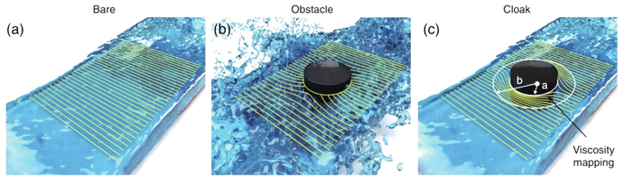 没有物体时流场是平直的(a),放入物体后流场被扰动(b),当覆盖一层流场隐身衣后流场恢复平直(c)。这种流场隐身衣在水下航行器隐身和水下减阻等领域中具有重要意义。