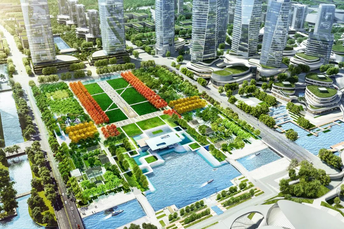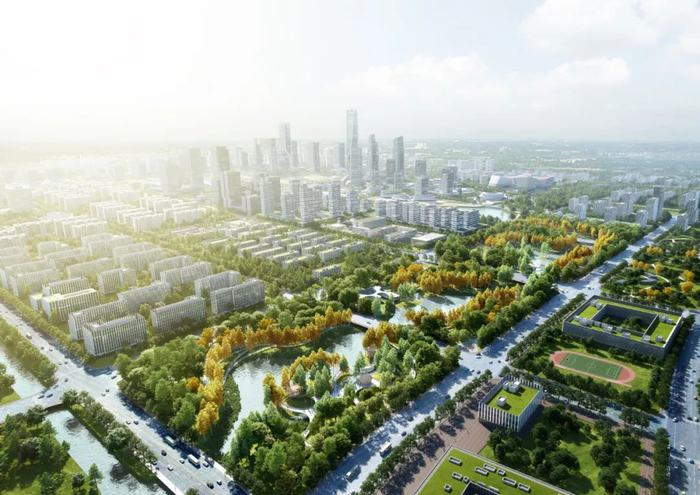 根据规划,位于苏州河前端的虹桥前湾,计划通过从苏州河向西引水,并开挖人工湖和河道,形成一个“C”形水系。这个地区将以前湾公园C形水系为主要脉络,形成1000亩以上水域、2500亩以上绿地,30个社区公园,再联通吴淞江的生态廊道,打造水绿交融的公园城市氛围。同时,结合蓝绿空间形成9公里的滨水慢行道、10公里的内圈慢跑道和18公里的外环骑行道,将水景渗入城市每个角落,实现“虹桥主城、尚水前湾”的发展愿景。