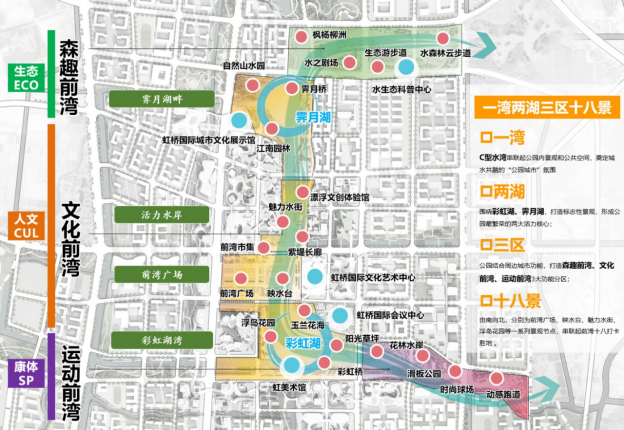 据介绍,前湾公园作为虹桥前湾地区的标志性项目之一,总用地面积76公顷。前湾公园定位为长三角生态绿色会客厅,融合中西方经典园林的设计理念和手法,打造“一湾两湖三区十八景”的景观格局。其C形水湾构成公园景观的主要脉络,围绕“彩虹湖”和“霁月湖”形成公园最繁荣的两大活力核心,森趣前湾、文化前湾、运动前湾三大分区内,十八处重要景观节点引人入胜。公园与周边城市功能无界融合,充分构筑前湾地区“五分水绿五分城”的生态格局。