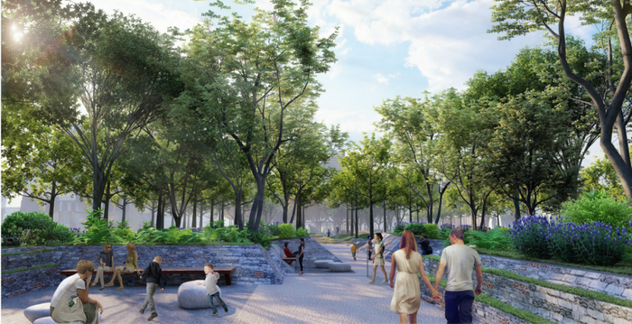 结合蜿蜒的河道和丰富的地形,布置樱花林慢跑道、多功能草坪、滑板胜地和AR动感地形跑道等全龄化运动设施,形成极具人气和活力的运动潮流地。