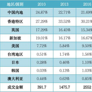 亚洲主要货币、欧洲和美洲货币在欧美市场的市场份额有着较大的差异。人民币、港元、新台币、日元、韩圆、新加坡元、印度卢比的外汇交易在伦敦和纽约的合计占比分别为34.31%、37.02%、37.27%、48.57%、41.40%、38.33%、38.58%;除英镑和俄罗斯卢布外,其它欧洲货币、澳大利亚元和新西兰元在欧美市场的份额平均值为59%;除美元外,美洲货币在欧美市场交易占比约71%。以此判断,人民币国际化程度已达到较高水平,不过与美元和欧元相比仍有较大差距,这正是人民币国际化战略重要方向之一。