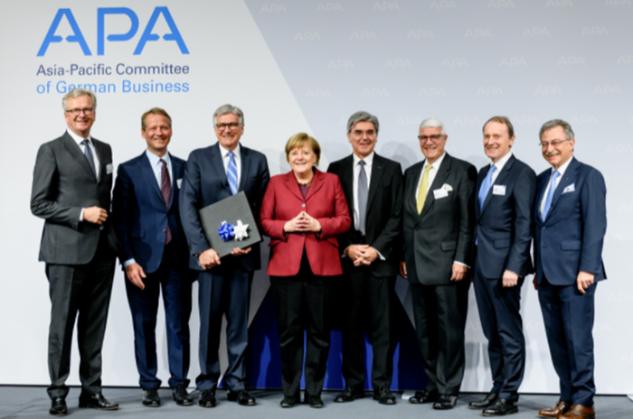 德国商业亚太委员会主席交接仪式,左起第三为前主席Hubert Lienhard、第四为前德国总理默克尔、第五为现任APA委员会主席Joe Kaeser。图片来源:APA官网。