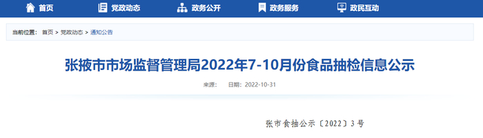 中国质量新闻网讯 2022年10月31日,甘肃省张掖市市场监督管理局公示2022年7月至10月食品抽检信息。