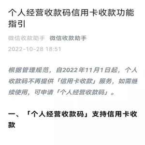 据“微信收款助手”日前发布的一则通知显示,根据管理规范,自2022年11月1日起,个人收款码不再提供“信用卡收款”服务,用户可以申请“个人经营收款码”继续使用,费率为实际付款金额的0.38%。