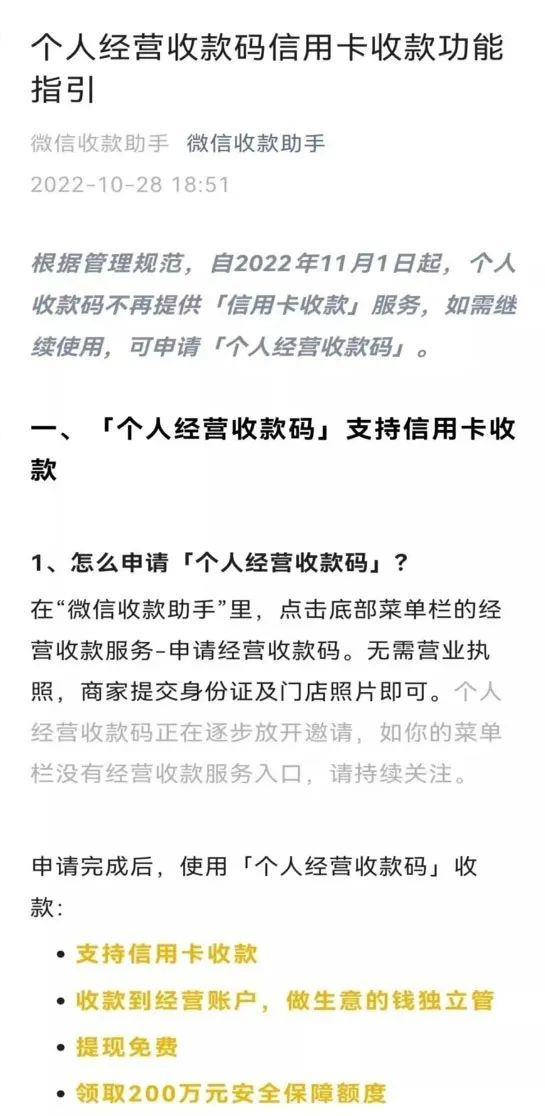 公开信息显示,微信支付10月28日发布《个人经营收款码信用卡收款功能指引》。