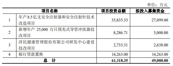 8月12日,济民医疗发布2022年度非公开发行股票预案(二次修订稿)。本次非公开发行募集资金总额不超过人民币49000.00万元,募集资金扣除发行费用后的净额拟全部投入年产8.5亿支安全注射器和安全注射针技术改造项目、新增年产25000万只预充式导管冲洗器技改项目、济民健康管理股份有限公司研发中心建设技改项目、银行贷款置换。