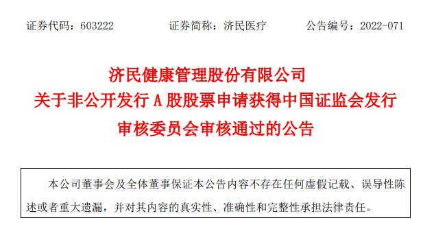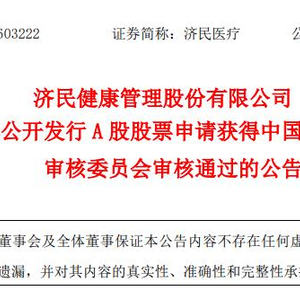 中国经济网北京11月2日讯 济民健康管理股份有限公司(简称“济民医疗”,603222.SH)昨晚发布关于非公开发行A股股票申请获得中国证监会发行审核委员会审核通过的公告。2022年10月31日,中国证券监督管理委员会(以下简称“中国证监会”)发行审核委员会对济民医疗非公开发行A股股票的申请进行了审核。根据审核会议结果,公司本次非公开发行A股股票的申请获得通过。