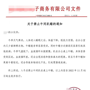 111月2日,据上游新闻报道,11月1日,一份名为“关于禁止午间趴睡的通知”的文件在网上热传,引发网友普遍关注。