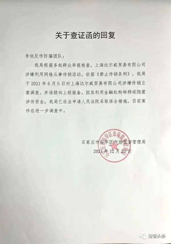 回复函中,裕华区市监局表示根据多起群众举报核查,达尔威涉嫌利用网络从事传销活动,因其利用金融机构转移或隐匿涉传资金,已经申请人民法院保全措施,目前案件在进一步调查中。