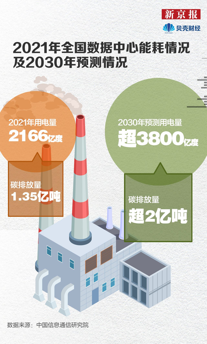 2021年,全国数据中心耗电量达2166亿度,约占全国总耗电量的2.6%,是北京全年用电量的1.8倍。全国数据中心碳排放量达1.35亿吨,占全国二氧化碳排放量的1.14%左右。