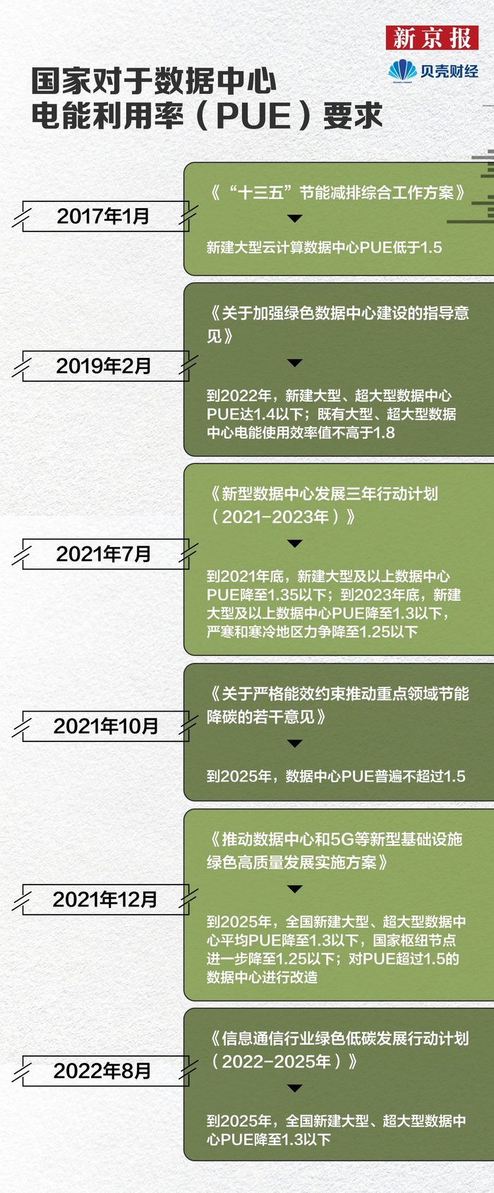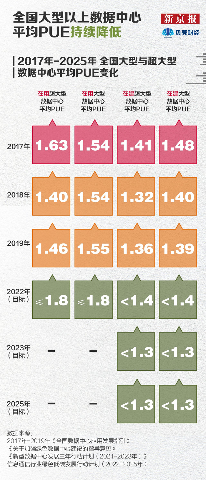 2017年,《“十三五”节能减排综合工作方案》提出,新建大型云计算数据中心PUE值低于1.5。2021年12月,国家发改委四部门发布新政提出,到2025年,全国新建大型、超大型数据中心平均PUE值降至1.3以下,国家枢纽节点还将进一步降至1.25以下。
