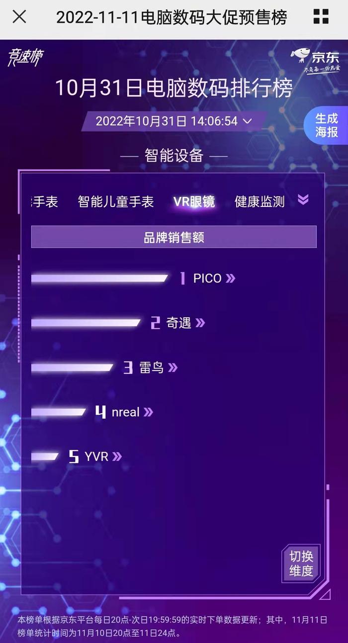今年双十一PICO也推出了不少优惠活动,各个抖音账号也轮番直播带货。抖音的PICO官方旗舰店显示,截至11月1日, 8+256G版本PICO 4已销售超6500件,按照客服的说法,此为双十一10月24日预售以来的销量;淘宝PICO官方旗舰店显示,以双十一活动价格售出的各版本PICO 4超过900件;京东电脑数码预售竞速榜显示,10月31日当天智能设备的VR眼镜品类中PICO的销售额排在第一,而此前PICO也已连续数天霸榜。