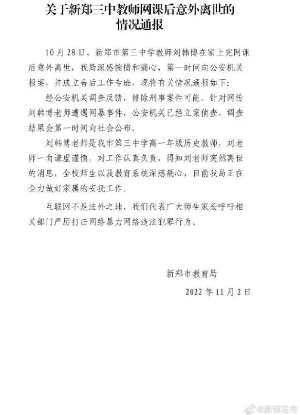 据@新郑发布 发布情况通报:10月28日,新郑市第三中学教师刘韩博在家上完网课后意外离世。新郑市教育局深感惋惜和痛心,第一时间向公安机关报案,并成立善后工作专班,现将有关情况通报如下:经公安机关调查反馈,排除刑事案件可能。针对网传刘韩博老师遭遇网暴事件,公安机关已经立案侦查,调查结果会第一时间向社会公布。