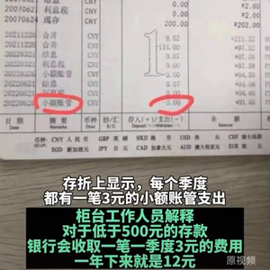 存折显示,每个季度都有一笔3元的小额账管支出。对此,银行柜台工作人员解释,对于低于500元的存款,银行会收取一笔一季度3元的费用,一年下来就是12元。