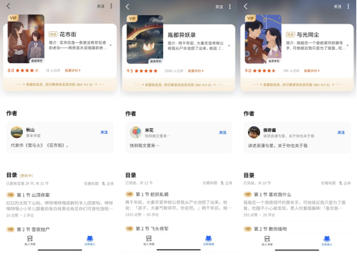 与此同时,多部获奖作品进入出版界和影视界的视野,进入IP开发阶段。盐选创作者“佩奇酱”创作的《与光同尘》获得青春校园赛道的冠军,其纸质书版权早早被出版社购得。此外多部作品进入影视版权竞价阶段。