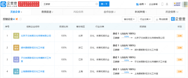 目前,王子文共有4家关联企业,包括湖州景朝影视文化工作室、子文映画影视文化传播新沂工作室、上海景朝影视文化工作室等,已全部注销。