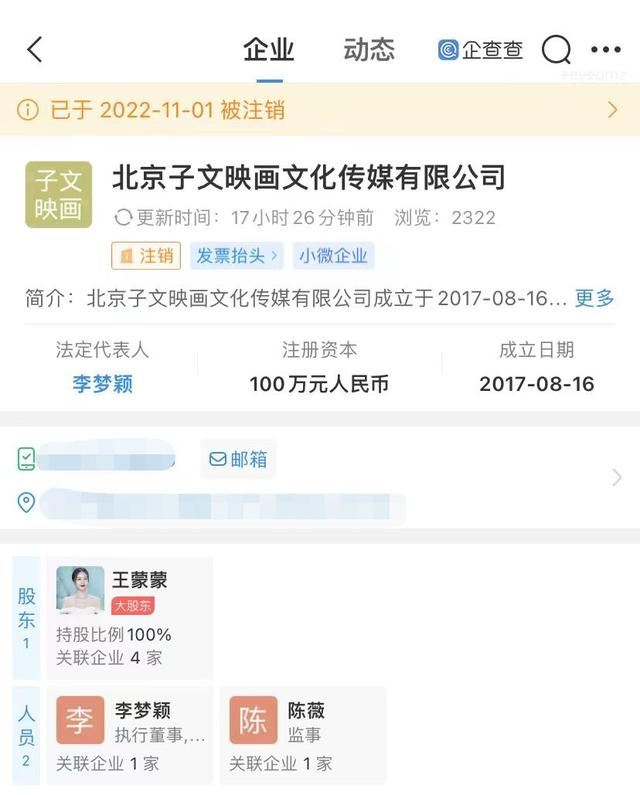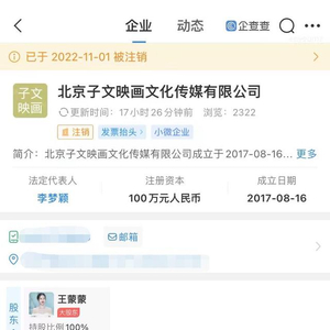 11月3日,企查查APP显示,11月1日,北京子文映画文化传媒有限公司注销,该公司成立于2017年8月16日,法定代表人为李梦颖,注册资本为100万元人民币,由艺人王子文(本名王蒙蒙)全资控股。