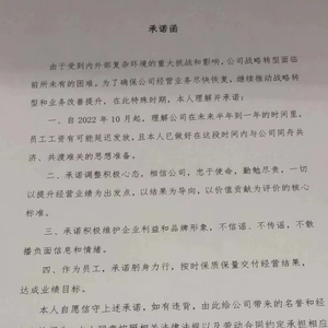 承诺函中提及需要员工理解工资延迟发放的可能性。“自2022年10月起,理解公司在未来半年到一年的时间里,员工工资有可能延迟发放,且本人已做好在这段时间内与公司同舟共济、共渡难关的思想准备。”