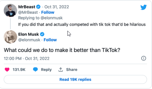 马斯克也一本正经地问回去:‘我们怎样才能让 Vine 变得比 TikTok 更出色?’其言语中透露,已开始对推特的短视频业务进行规划。