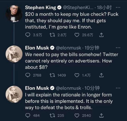 随后,马斯克今日在其 Twitter 上发文回应称:‘我们需要以某种方式支付账单!Twitter 不能完全依赖广告商。8 美元怎么样?’