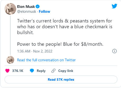 接着,在周一,马斯克在 Twitter 上正式发文称,‘Twitter Blue’的订阅费用将从现在的每月 4.99 美元变为每月 8 美元,涨价 60%。