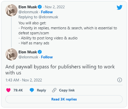 截至目前,马斯克的推文似乎没有提供更多关于这项特殊福利的细节,但‘绕过付费墙’的推文似乎表明,作为‘Twitter Blue’订阅的一部分,用户有一天可以绕过参与出版商的付费墙。如果这最终成为事实,这项福利可能比无广告阅读体验更好。