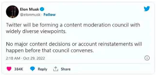此外,马斯克在 10 月 28 日表示,他计划成立一个‘内容审核委员会’,为公司作出重要的审核决定。