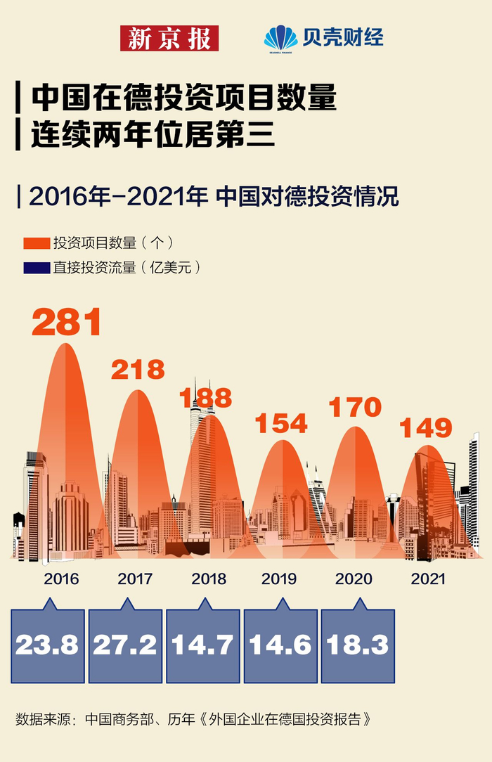 近年来,中国企业也在持续加大在德国的投资,中国是对德投资三大重要来源国之一。德国联邦外贸与投资署报告显示,2021年,中国在德投资项目149个,数量连续两年位居投资来源国第三位。