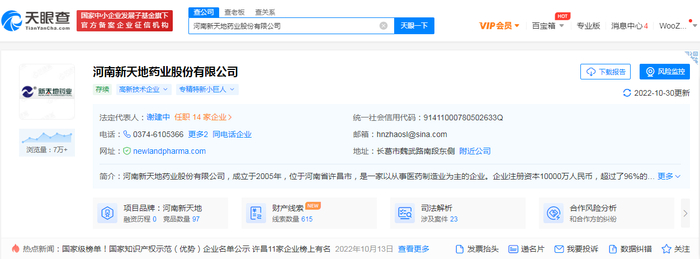 天眼查信息显示,新天地成立于2005年9月,主要从事手性医药中间体的研发、生产和销售。主要产品为左旋对羟基苯甘氨酸系列产品和对甲苯磺酸。