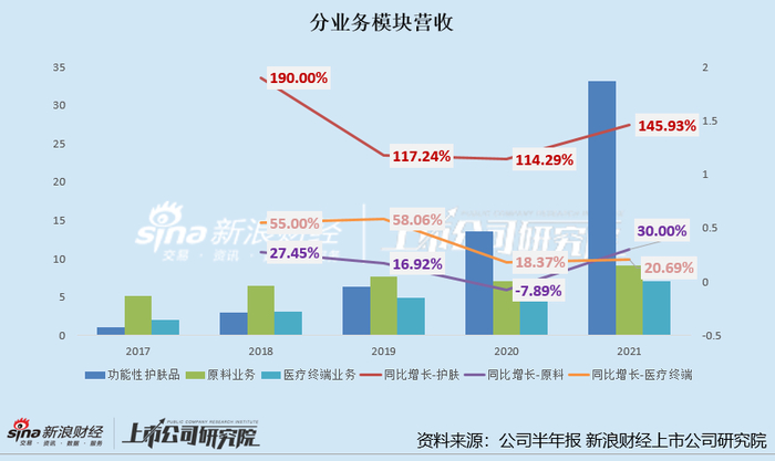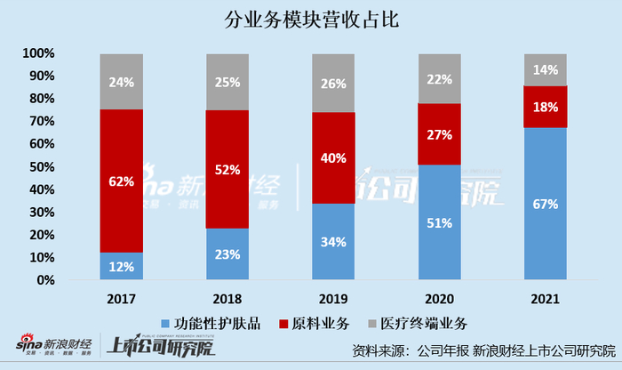 原料业务营收占比从2017年的62%,降低至2021年的18%;医疗终端业务营收占比从2017年的24%,降低至2021年的14%;而功能性护肤品业务营收占比则从2017年的12%,快速提升至2021年的67%