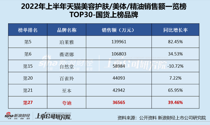 2022年上半年天猫美容护肤/美体/精油销售额一览榜TOP30中,华熙生物旗下众品牌仅有夸迪上榜,该品牌销售额约为3.66亿元,同比增长39.46%,位列第27名。珀莱雅集团旗下核心品牌珀莱雅、贝泰妮集团旗下核心品牌薇诺娜销售额则是位列榜单第5名、第6名。