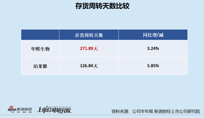 同期,珀莱雅的存货周转天数为126.84天(4个多月),华熙生物的存货周转天数约为珀莱雅的2倍多。这是否在向我们暗示,华熙生物旗下的护肤品并没有珀莱雅那么好卖呢?