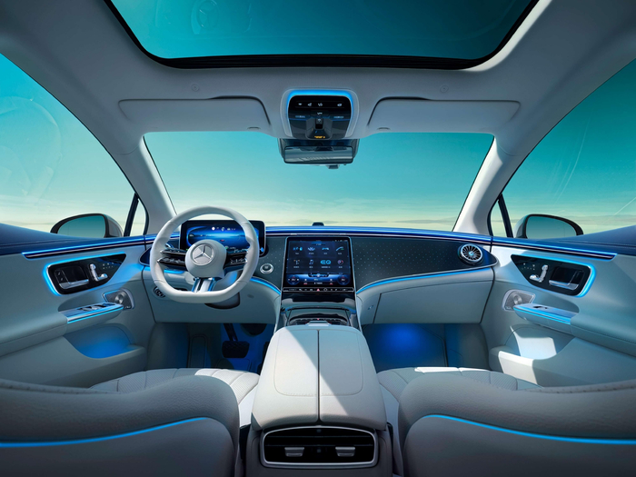 全新EQE配有源自S级轿车的12.3英寸仪表屏与12.8英寸的中控屏,屏幕分辨率最高210ppi,画质可媲美平板电脑;入门级的先锋版采用胡桃木饰板,高配的先型特别版则配备带背光的星徽饰板。全新EQE有配备主动式环境氛围灯,灯带颜色可随车速变化呈现动态流动效果,在车内氛围这项可谓满分。