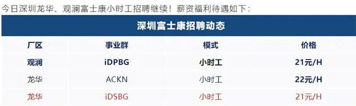 11月4日凌晨,微信公众号“富工联观澜招聘”发布消息称,深圳观澜富士康IDPBG事业群招聘高价小时工,2022年11月至2023年1月31日,工资为21元/小时,主要生产、组装、测试苹果手机。