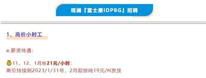 而从11月3日至11月4日,富士康深圳观澜IDPBG事业群开始招聘员工,2022年11月至2023年1月31日工资待遇为21元/小时,2023年2月起按19元/小时发放,主要生产、组装、测试苹果手机