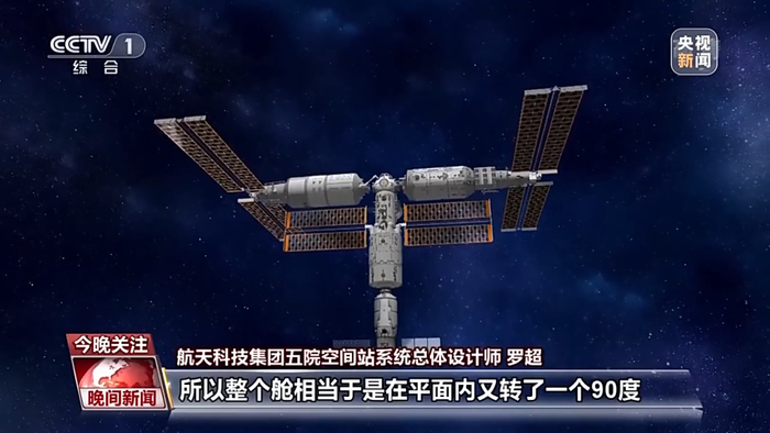 航天科技集团五院空间站系统总体设计师 罗超:滚转式的转位,形象来说,就是被转舱体的转动完成后,舱体整个对天对地面是变了,平面转位的方案,其实是不绕自身旋转,相当于是一个转动加一个平动过来的,整个舱相当于是在平面内转了一个90度。