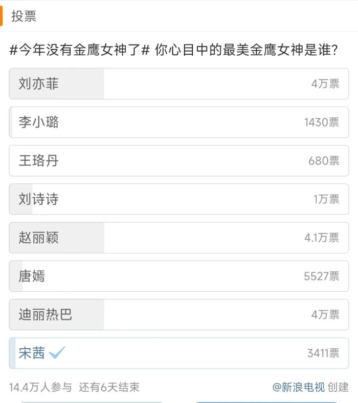 现在,金鹰女神取消,这个头衔也成为历史。对此,有人觉得遗憾,也有人觉得应该。更多网友,则讨论起了往届金鹰女神,微博@新浪电视还做了一个投票“你心目中最美的金鹰女神是谁?”,投票最多的前三位是赵丽颖、刘亦菲和迪丽热巴。