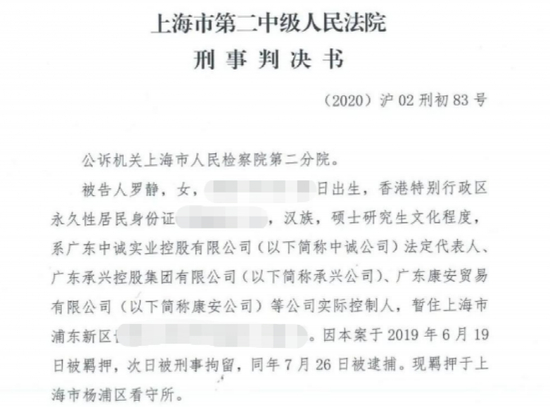 判决书显示,罗静出生于1971年7月,具有香港永久居民身份,硕士研究生学历。罗静系广东中诚实业控股有限公司法定代表人,并实际控制广东承兴控股集团有限公司、广东康安贸易有限公司等多家企业。
