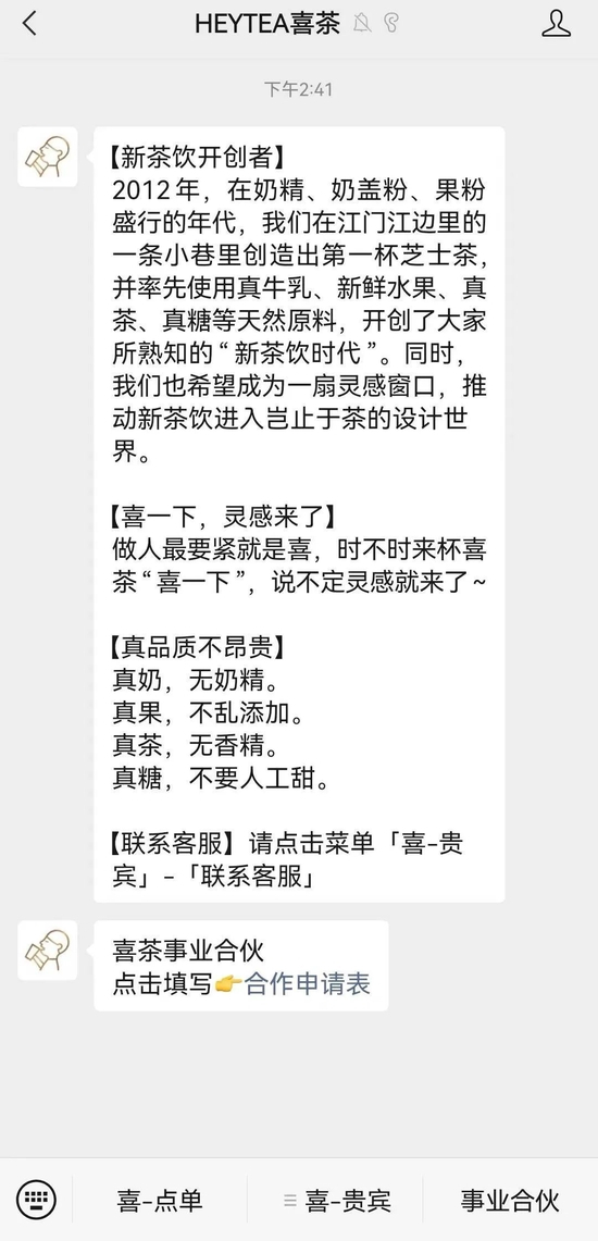 喜茶方面表示,为了保障喜茶事业合伙门店提供与现有门店同样的高品质产品和服务,喜茶建立了业内最严格的事业合伙人筛选标准和完善的培训考核流程。首先最基础的就是成为合格的喜茶员工、在门店工作超过3个月、充分理解和认同喜茶的品牌精神和企业文化。