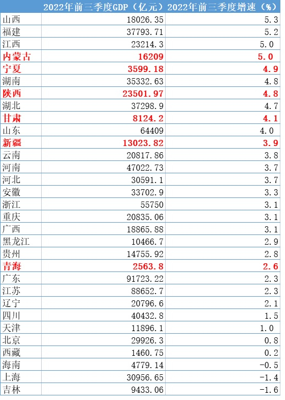 今年前三季度,陕西、甘肃、青海、新疆、宁夏和内蒙古这几个省份GDP分别增长了4.8%、4.1%、2.6%、3.9%、4.9%和5%,除了青海,增速都位居全国前十位,西北地区经济增速整体性的跃升至全国第一方阵。