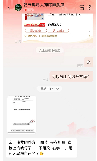 但这并不能难倒部分商家违规操作。10月18日,新京报记者在某电商平台上咨询是否可以线上问诊开方是,商家发给记者一份日期显示为2021年、诊断为“控制血糖”并开药“诺合力 利拉鲁肽注射液”的处方签,并告诉记者直接上传该处方,不用改名字就可以购药。
