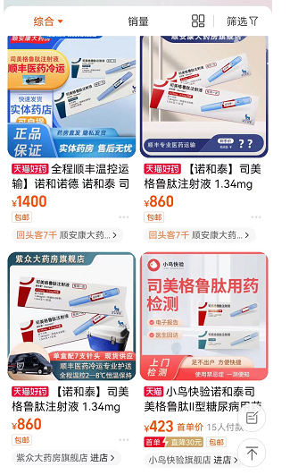 在医院用药紧张的同时,各大电商平台的线上药房中却上架了大量司美格鲁肽注射液。某电商平台上的“紫众大药房旗舰店”中规格为3ml的司美格鲁肽注射液,售价为1700元。